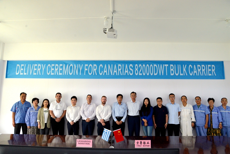 On September 9, 2025, Jinglu shipyard officially delivered the 82,000 DWT bulk carrier "CANARIAS" to Laskaridis Maritime. Wang Hong, General Manager of Jinglu shipyard, and Mr. Alexandros Vrachliotis, a representative of Laskaridis Maritime, jointly signed the delivery documents. The vessel, which embodies the joint efforts of both parties, was successfully delivered 121 days ahead of the contracted delivery date. This ship is the 33rd vessel delivered by Jinglu shipyard to the Laskaridis Group.